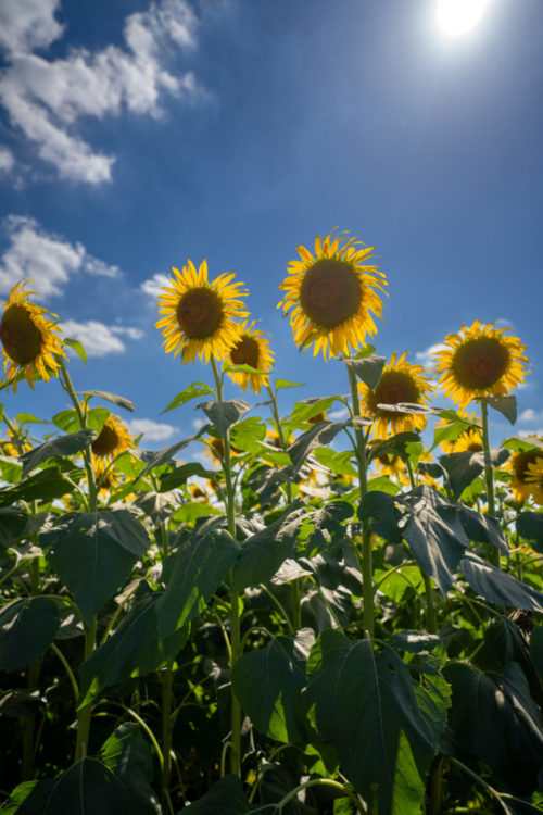 • ローアングルから撮影:しゃがんでカメラを構え、空とひまわりを背景にすると被写体が映える